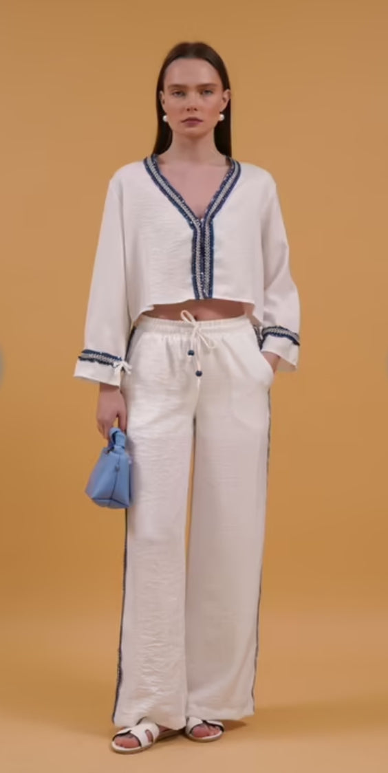 Linnen Pak- Korte Witte Blouse Met Gestrikte Mouwen en Denim Strepen Broek