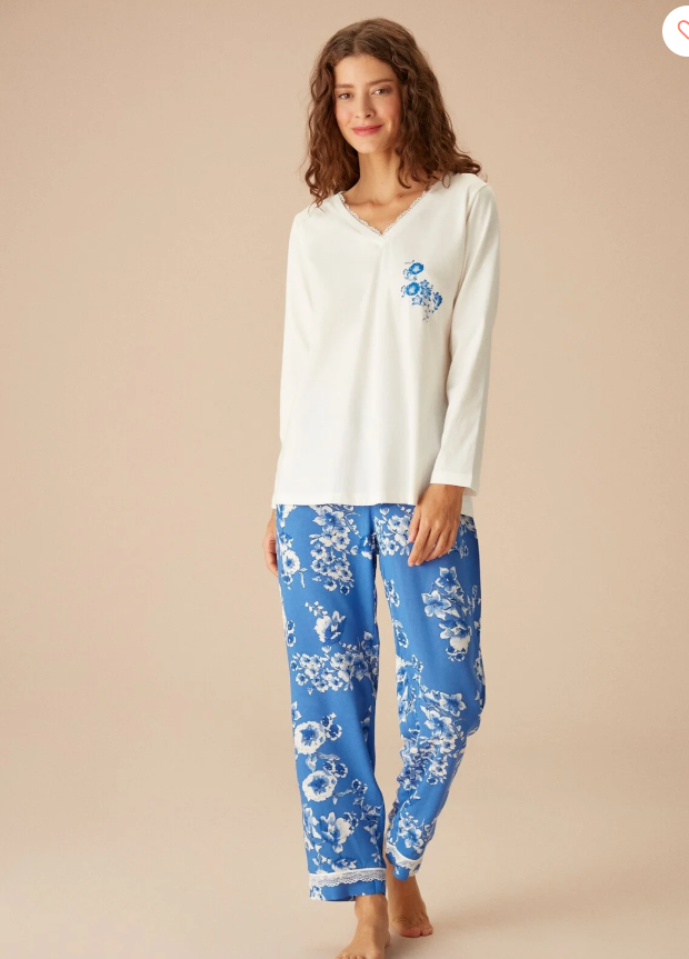 Pyjama Set, met zijn elegante ontwerp met witte bloemen op blauw en rood