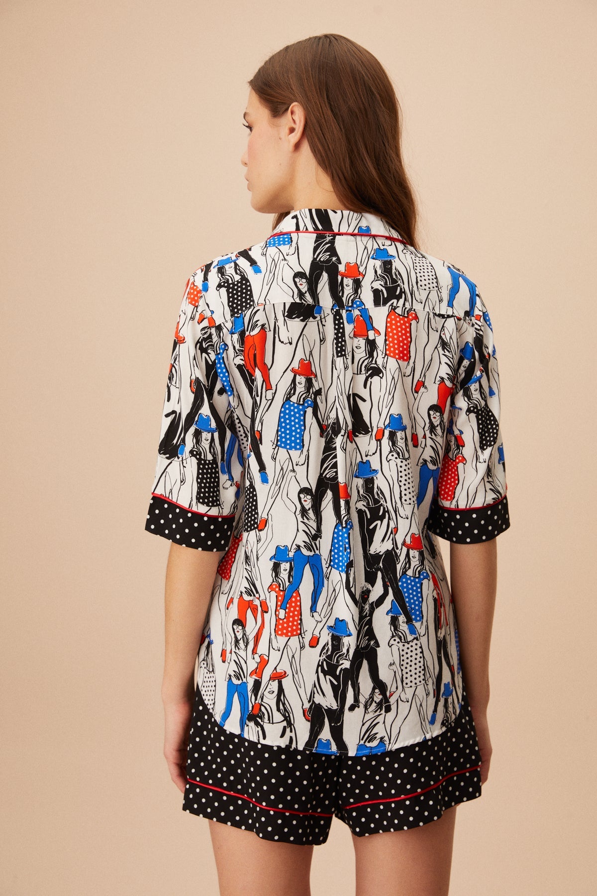 De trend van het seizoen met zijn kleurrijke en leuke ontwerp, de pop-art pyjamaset brengt de energie van de zomer naar je toe met zijn gedessineerde bovenkant, De short heeft bekleed elastiek in de taille